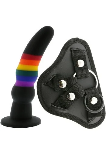 Här har vi ett rejält harness med en medföljande härlig prideinspirerad dildo. Dildon är tillverkad i mjuk silikon och är helt fri från gifter. Leksaken är riktigt mjuk och flexibel. Det kurvade?: